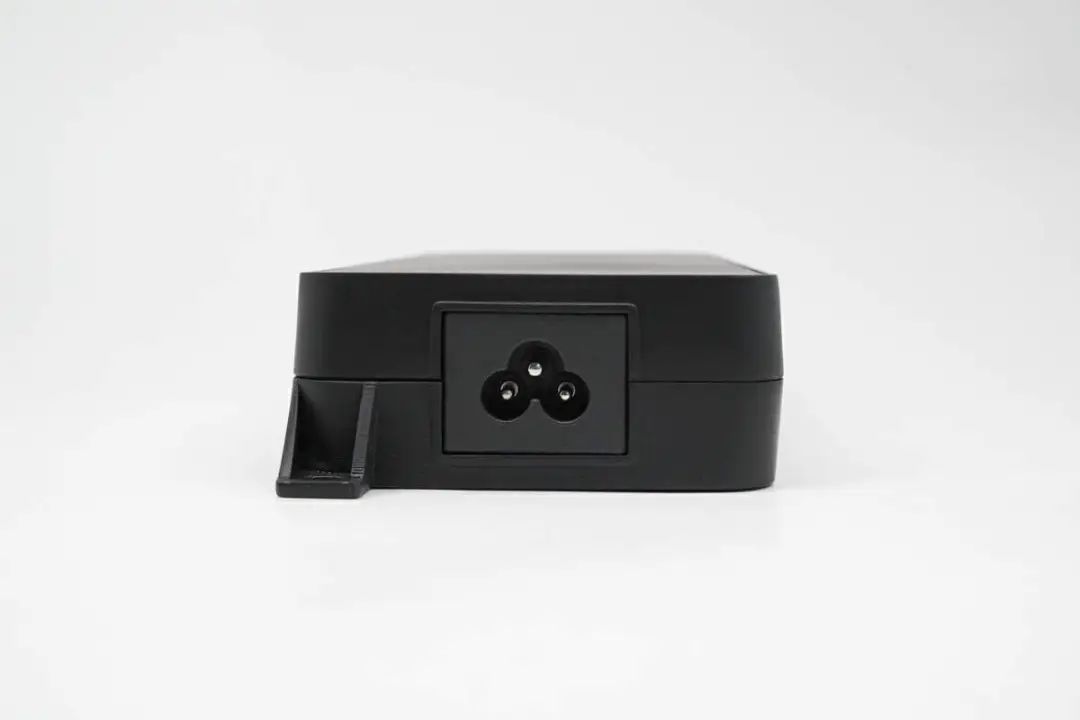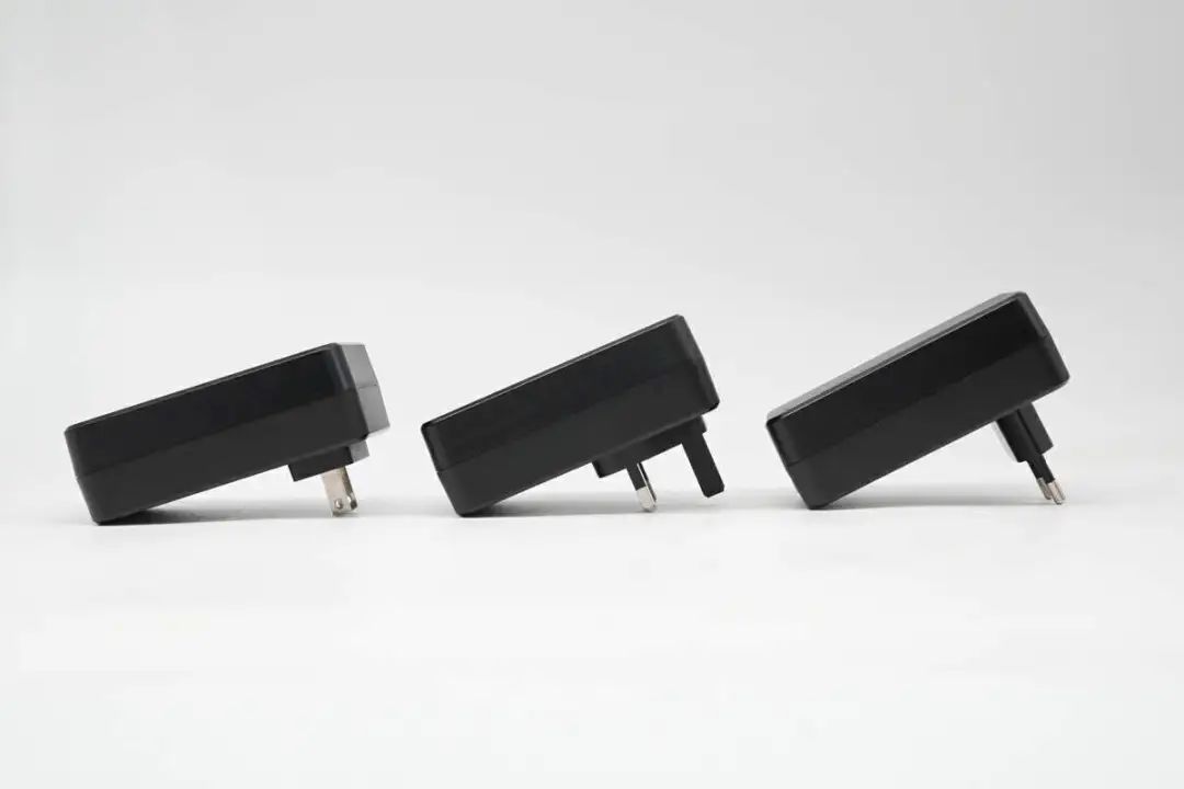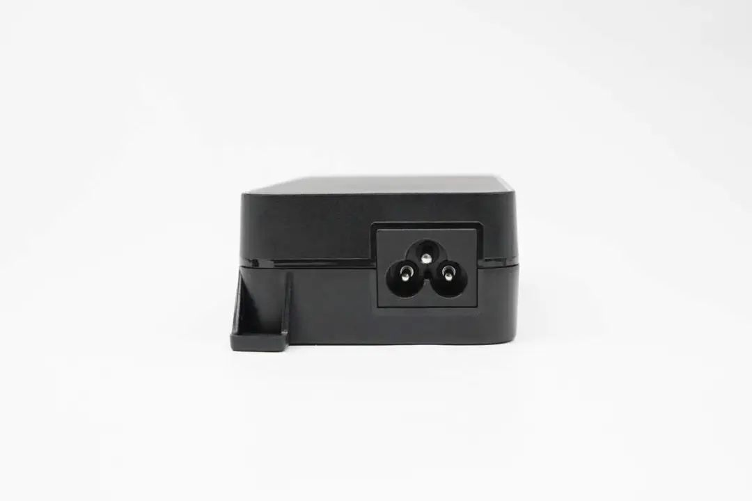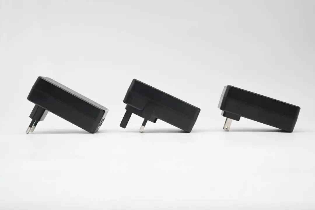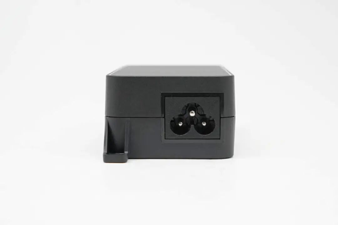 雅晶源科技 30W 插墙式 ACTIVE PoE 电源适配器造型设计与 15W 适配器一致,体积不同,产品通体黑色,整体质感出色,三款产品仅插脚不同。