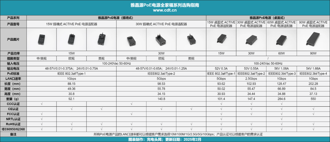 PoE 电源(以太网供电电源)能够通过以太网线缆同时传输数据和电力的技术,特殊的电路设计将直流电源叠加到数据信号上进行传输。在接收端,数据信号和电源通过 PoE 分离器被分离,分别供给设备的不同组件使用。雅晶源科技推出 PoE 电源全家福系列,该系列精心设计了桌面式与插墙式两种外壳模具,全面覆盖 IEEE802.3af、IEEE802.3at 至 IEEE802.3bt 的全功率段标准。此系列不仅兼容 1G、2.5G、5G 直至 10G 的高速网络传输,还获得了 CB、CCC、CE 、FCC 及 NRTL等国际权威安全认证,彰显了其卓越的性能与全球认可的安全标准。