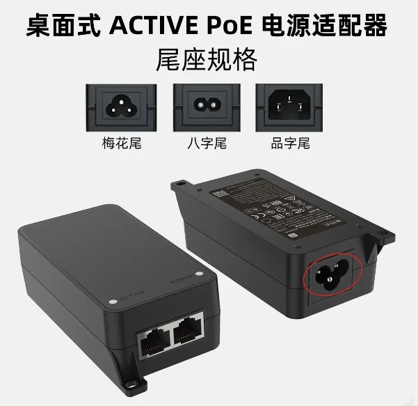 此外,15W、30W、60W、90W 所有桌面式 ACTIVE 系列 PoE 电源适配器的尾座规格有品字尾、八字尾、梅花尾三种可选。