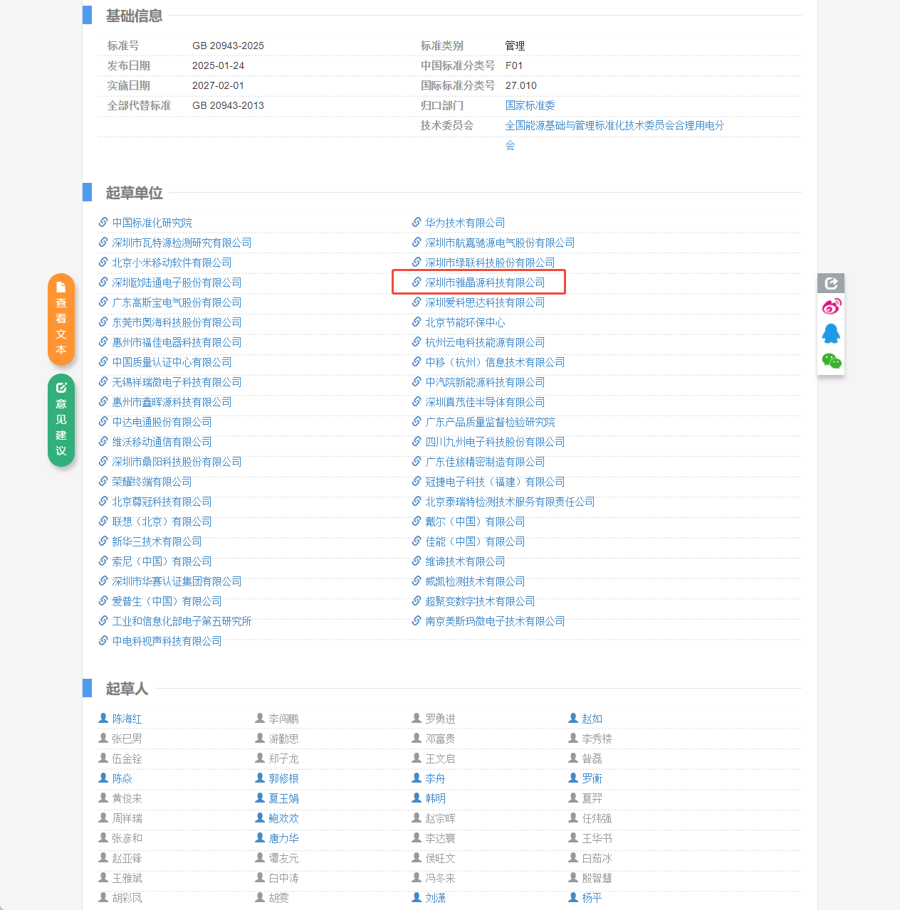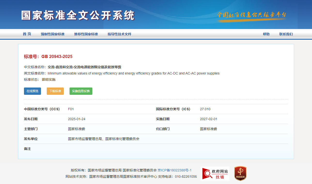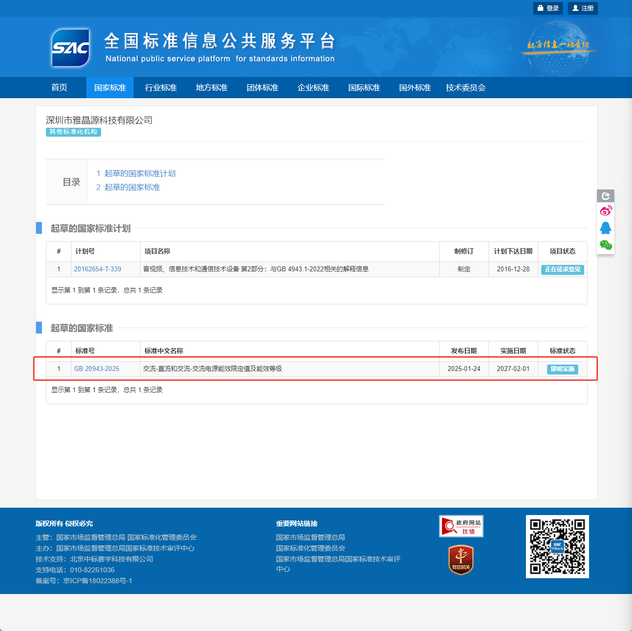 在中国持续推动高质量发展的浪潮中,电源能效成为了衡量行业进步的重要标尺。近日,国家标准委发布了最新版中国电源能效标准GB 20943-2025《交流-直流和交流-交流电源能效限定值及能效等级》,这一标准将全面替代GB 20943-2013,并于2027年2月1日正式生效。充电头网在全国标准信息平台查询最新版中国电源能效标准时,发现了一家拥有十七余年深厚电源行业积淀的资深企业。